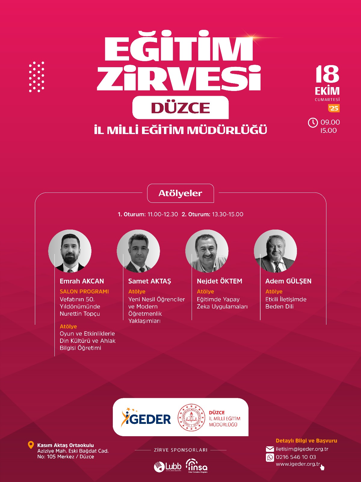 Zirvemiz kapsamındaki Atölyelerin ilk oturumları 11.00 - 12.30 saatleri arasında, ikinci (tekrar) oturumları ise 13.30-15.00 saatleri arasında gerçekleşecektir.